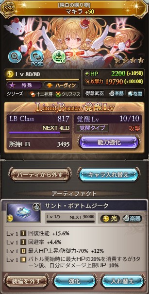 「バトル開始時に最大HPの20%を消費するが3ターン後、自分にダメージ上限UP 10%」